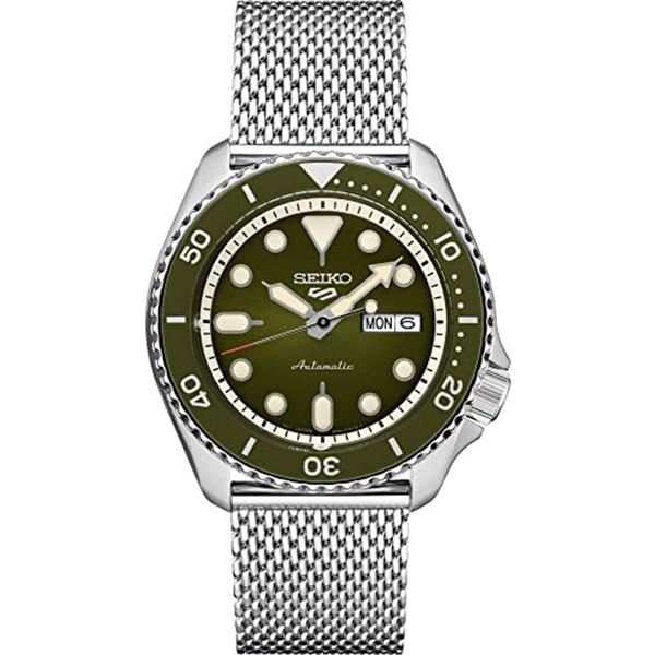 STAINLESS STEEL STRAP, SILVER/GREEN, WATER RESISTANT TO 10 BAR, 100 METERS, MODEL: SRPD75, AMZ SES, MSRP. $342.80