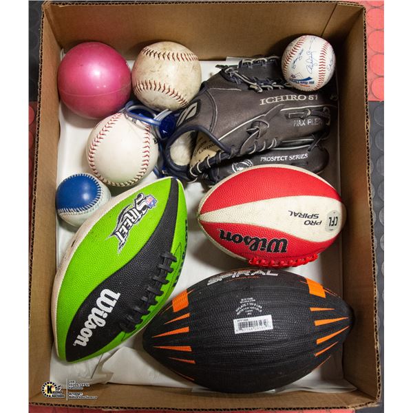 51 MAX FLEX LEFT HAND BASEBALL GLOVE - 3 WILSON FOOTBALLS, 2 SOFTBALLS, 2 BASEBALLS, WEIGHT BALL, SWIM GOGGLES, ETC.
