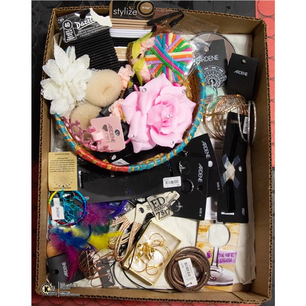 BOX WITH BASKET FULL OF NEW HAIR ACCESSORIES &