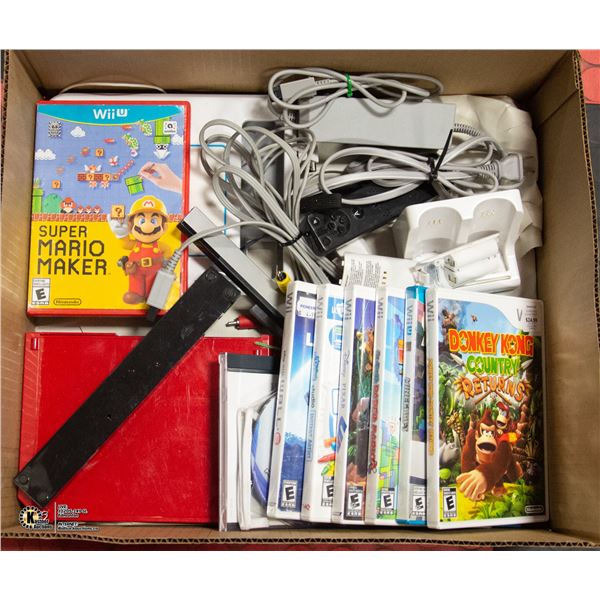 9 GAMES INCL. WII DRAW GAME TABLET, WII SUPER MARIO MAKER, MARIO KART, DRAW STUDIO, DONKEY KONG COUNTRY, REMOTE CHANGING BASE, ETC.