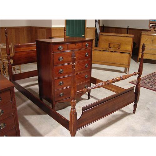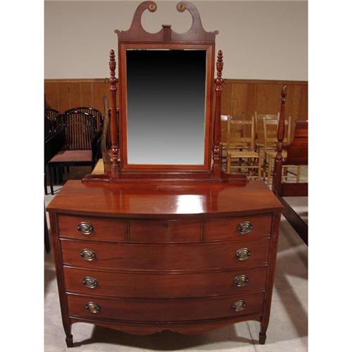 3 PIECE DIXIE MAHOGANY BEDROOM SUITE. Has reeded column double poster bed with acorn finials (55” H), serpentine front chest with 5 graduated dovetailed drawers on spade feet (47.5” H, 36” W, 20” D), serpentine front bureau with 4 graduated dovetailed drawers with attached mirror with broken arch top (73.5” H to top of mirror, 34.25” H to top of bureau, 46.25” W, 21” D).
