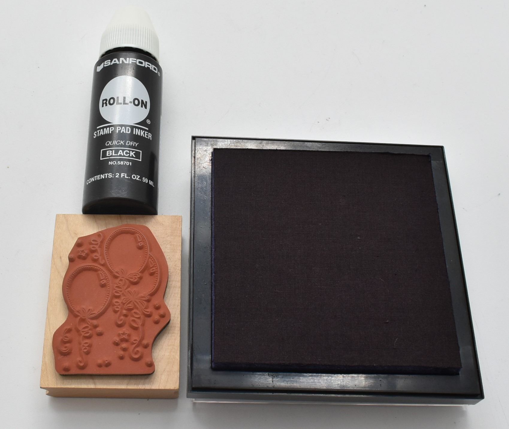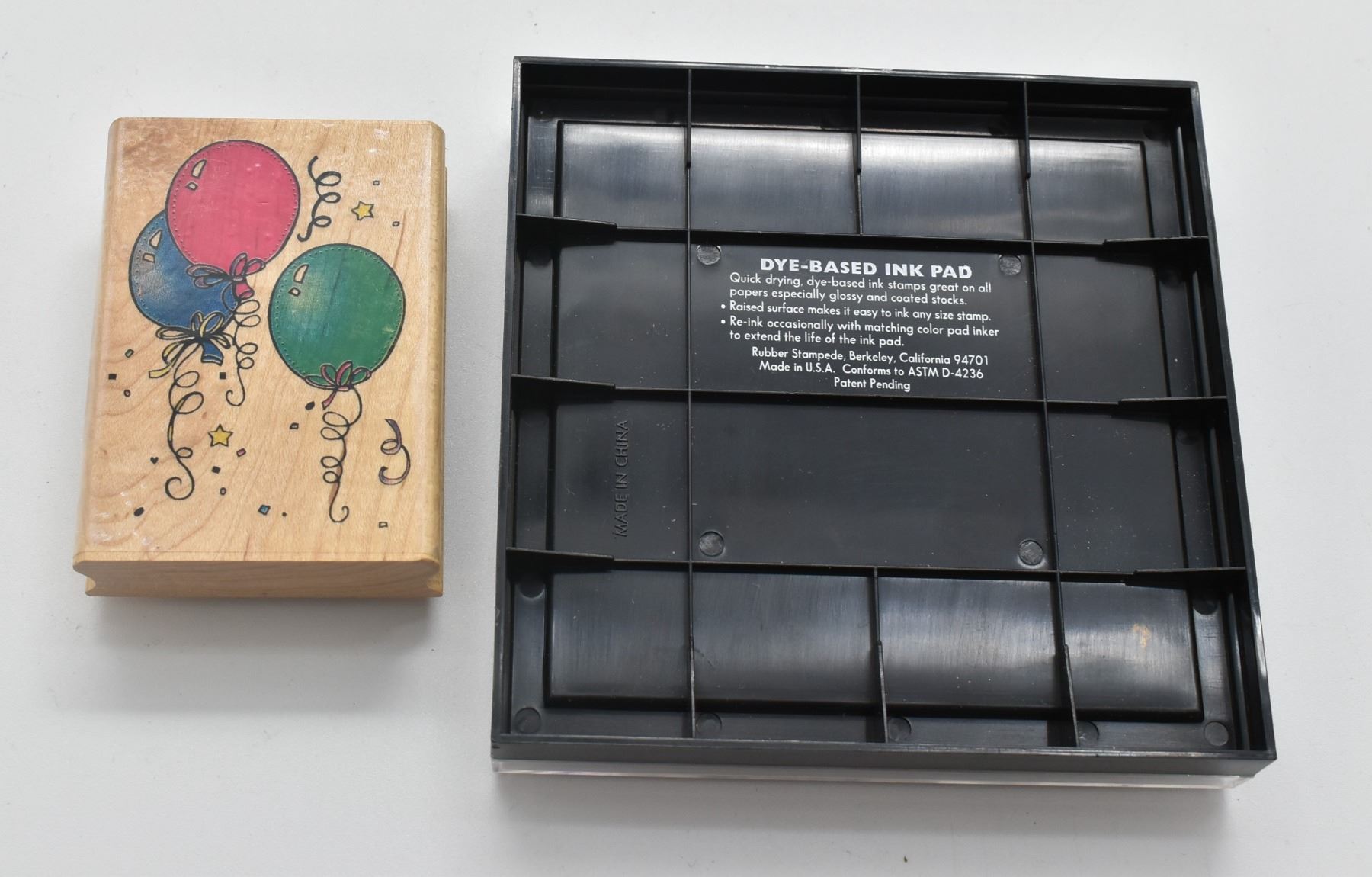 DIY Stamp Pad Trio, 3 DIY stamp pad items to ''add to'' or start a new do-it-yourself project, the large stamper, a trio of balloons for a variety of occasions, measures 3.25'' x 2.25'', secondly is a Jewel Box, acid-free, black ink pad, along with Sandford's ''Roll-On'' stamp pad inker, all items unused