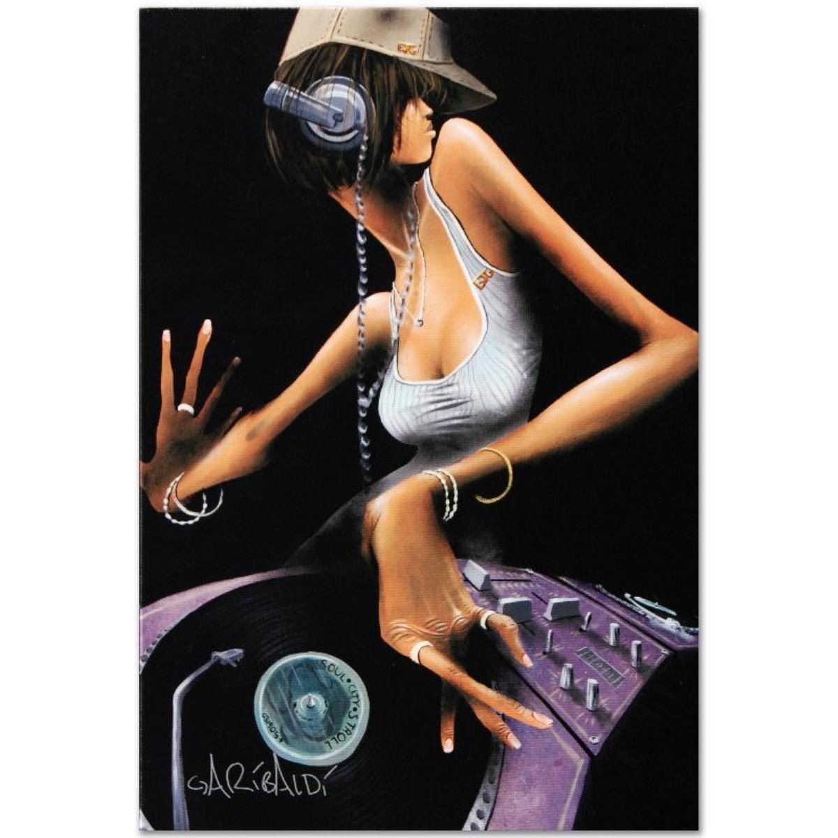 Combining his passions for music and art, David Garibaldi creates visual poetry! "DJ Free" is a limited edition giclee on stretched canvas, CC numbered from the miniature series and bearing the artist's authorized signature. This piece comes gallery wrapped. Includes Certificate of Authenticity! Measures approx. 12" x 18" (image).