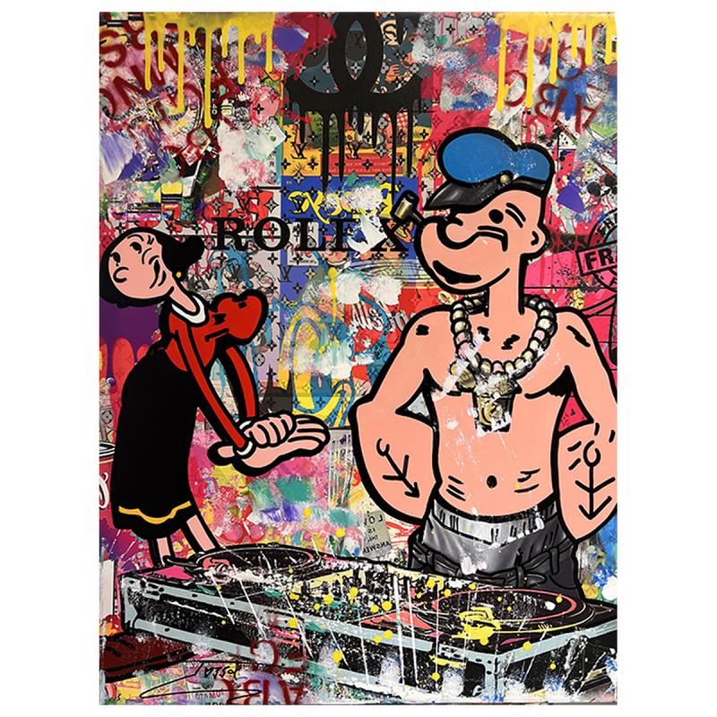 "DJ Popeye" is a unique mixed media acrylic on gallery wrapped canvas by Jozza. Hand Signed by the artist and titled in verso, the piece comes with a letter of authenticity. Measures approximately 30" x 24" (image).