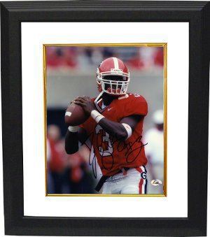 In 2002 as a redshirt freshman, playing in parts of 10 games, DJ Shockley completed 32 of 52 passes (61.5%) for 615 yards with 5 TDs and 2 interceptions. He also threw a 37-yard TD pass in the Nokia Sugar Bowl win over Florida State University as the Bulldogs wrapped up their first SEC Championship season in 20 years. Shockley won the National Bobby Bowden Award, finished 3rd in the voting for Associated Press Player of the Year, behind Reggie Bush and Vince Young. DJ Shockley has hand autographed this Georgia Bulldogs 8x10 Photo. Custom White Mat and Premium Black Frame as shown. FI Hologram and Certificate of Authenticity from Athlon Sports.