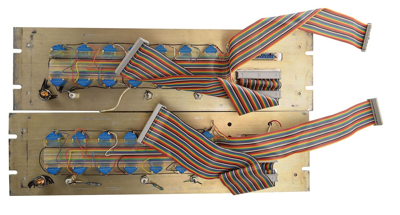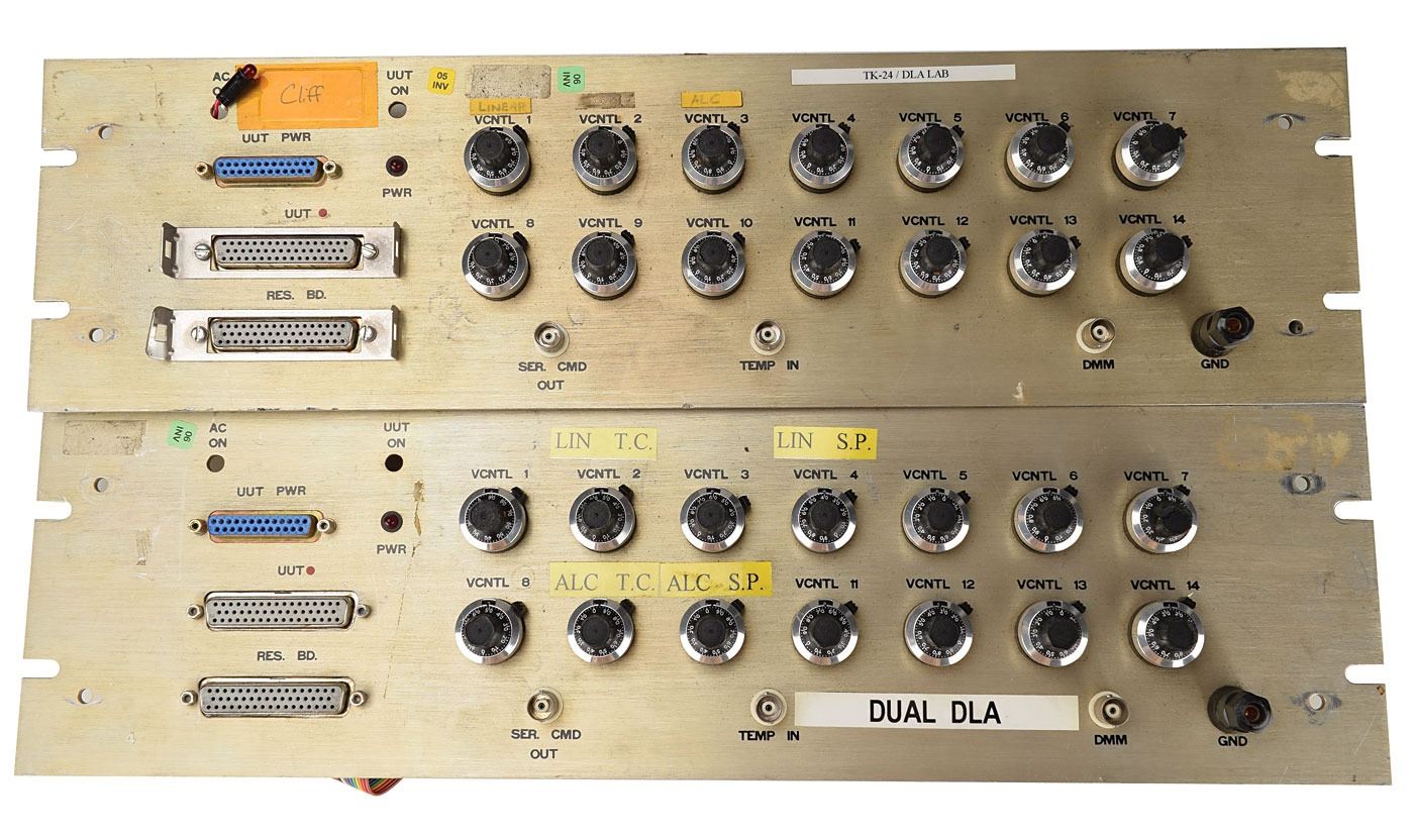 Pair of DLA test panels, measuring 19? x 5.25?, with each featuring numerous knobs on the face and rainbow ribbon cables to the rear. In overall very good to fine condition.
