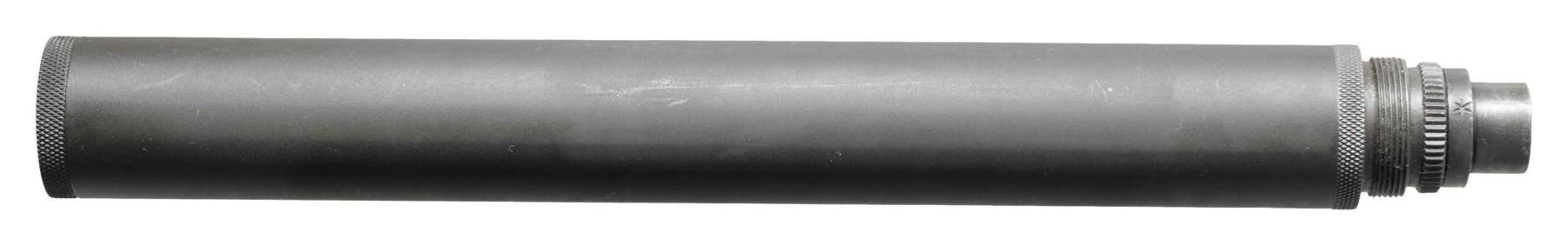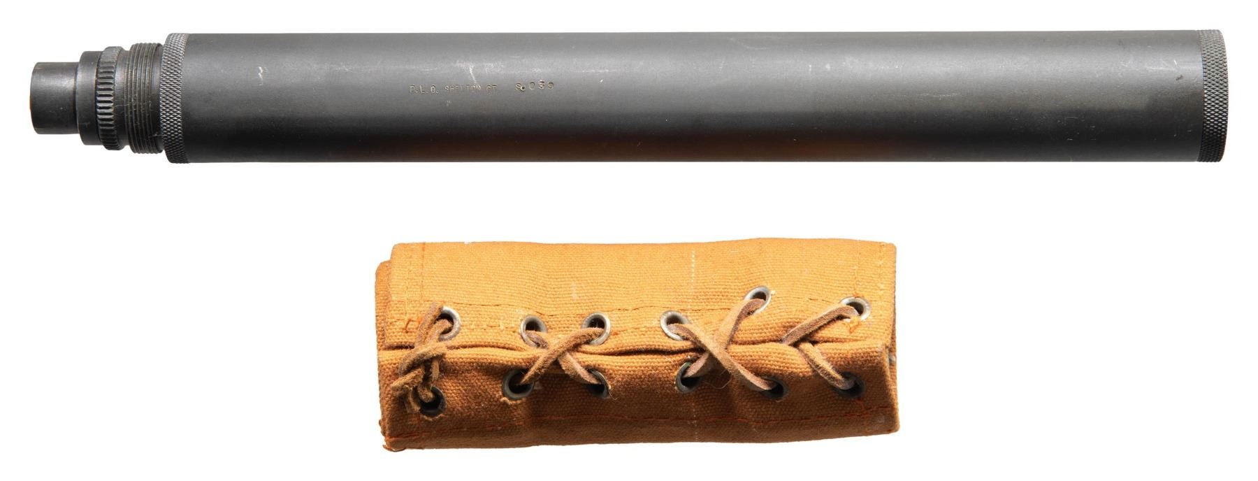 Cal. 9mm. S# S039. Model SPL 9mm silencer mfg. by DLO. Tube is marked "D.L.O. SHELTON CT. S.039". Silencer measures 13 1/4" in length. Metal components exhibit a matte blue finish overall. Silencer is wrapped in a Sten pattern wool and canvas handguard. CONDITION: exterior is very good, with some superficial marks from handling and storage. Interior is excellent, with nearly no / no evidence of prior use. Handguard is very good overall. NATIONAL FIREARMS ACT SUPPRESSOR REQUIRING BATF TRANSFER BEFORE TAKING POSSESSION. FULLY TRANSFERABLE. (03-1866/MLW). MODERN CLASS III. $300-600.