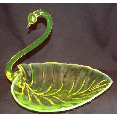The swan from the top of its neck to the bottom is 11". The neck itself is about 9". The bowl measures about 11 1/2" x 11 1/2". The rim of the bowl sits at its highest 3 3/4". The bottom of the bowl it is polished smooth for first sitting. In these polished parts, which is akin to a polished pontil, you have the appropriate age marks. The swan is from the 1920's - 1930's. There is some very, very light scratching from it being used over the years, but unless you inspect it closely, it is not seen. The bowl has a leaf pattern effect. Also, the entire swan fluouresces under black light from the uranium content. (last two photos show under black light)