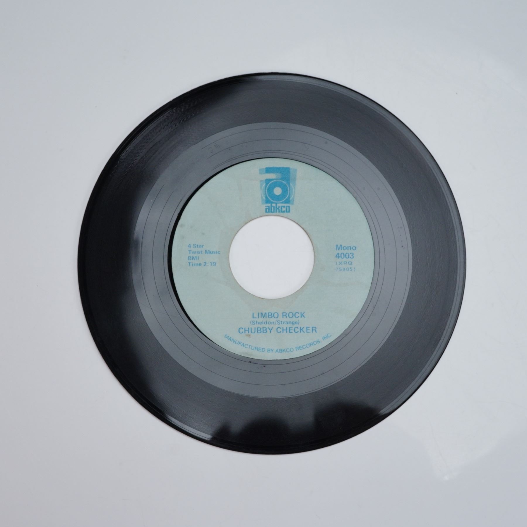 A vintage vinyl LP titled Chubby Checker: 20 Greatest Hits, issued by DMC Records. Showcases a compilation of the artist's most iconic dance tracks including "The Twist," "Let's Twist Again," "Pony Time," and "Limbo Rock." The gatefold-style cover displays live performance imagery of Chubby Checker and lists all 20 tracks across both sides, with matrix number S-5813 etched in the runout. Also included is a 7-inch 45 RPM single of "Limbo Rock," manufactured by ABKCO Records.