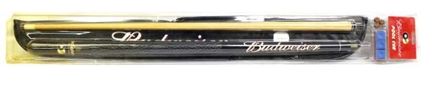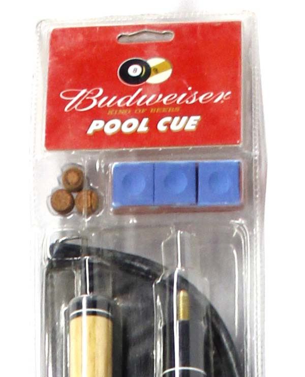 DMI Sports Budweiser Pool Cue #RCBLUDCLM, in original packaging, includes chalk, additional tips, and carrying case, has never been opened, measures 37.5'' x 4.75''W