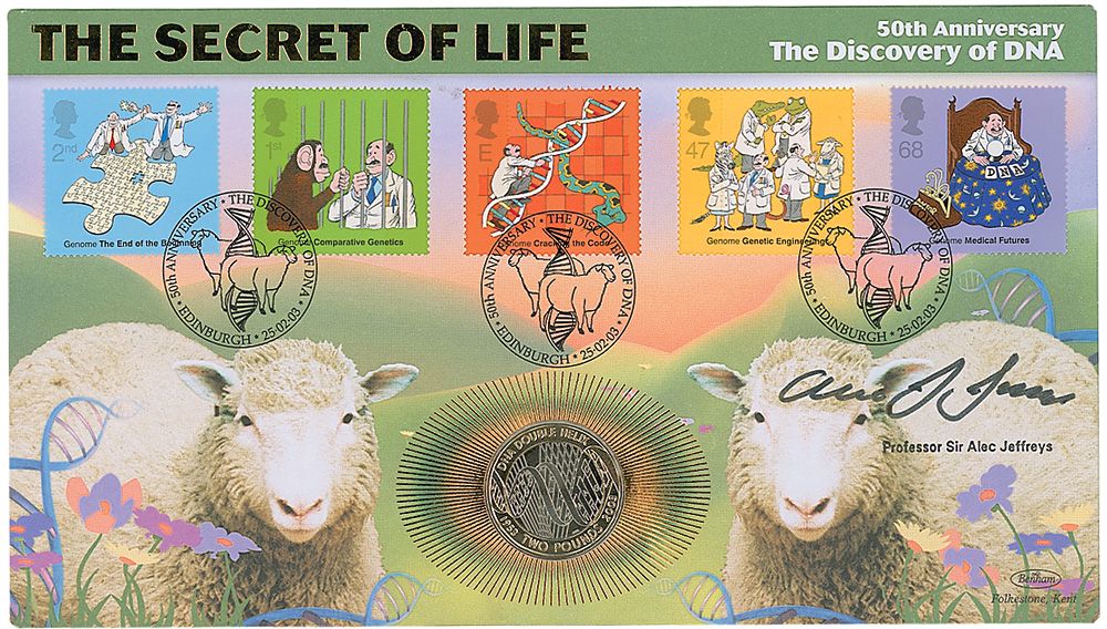 British geneticist responsible for creating the methods used for DNA fingerprinting and profiling. Benham color Commemorative Cover honoring the 50th Anniversary of the Discovery of DNA, featuring images of Dolly, the famed sheep that was cloned at the Roslin Institute in Edinburgh, and a two-pound piece, dated 2003, honoring the Double Helix. Cover is adorned with five stamps tracing the life of DNA, and signed in black felt tip, “Alec J. Jeffreys.” In fine condition.