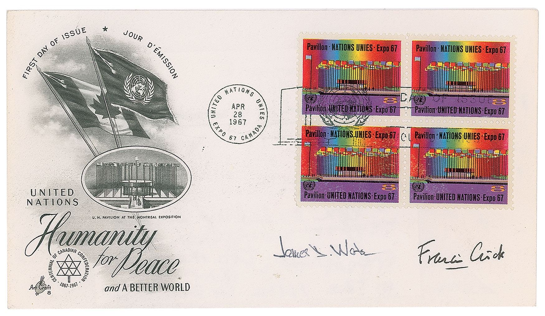 FDC with a cachet honoring the United Nations, signed in ink, "James D. Watson" and "Francis Crick." In fine condition.