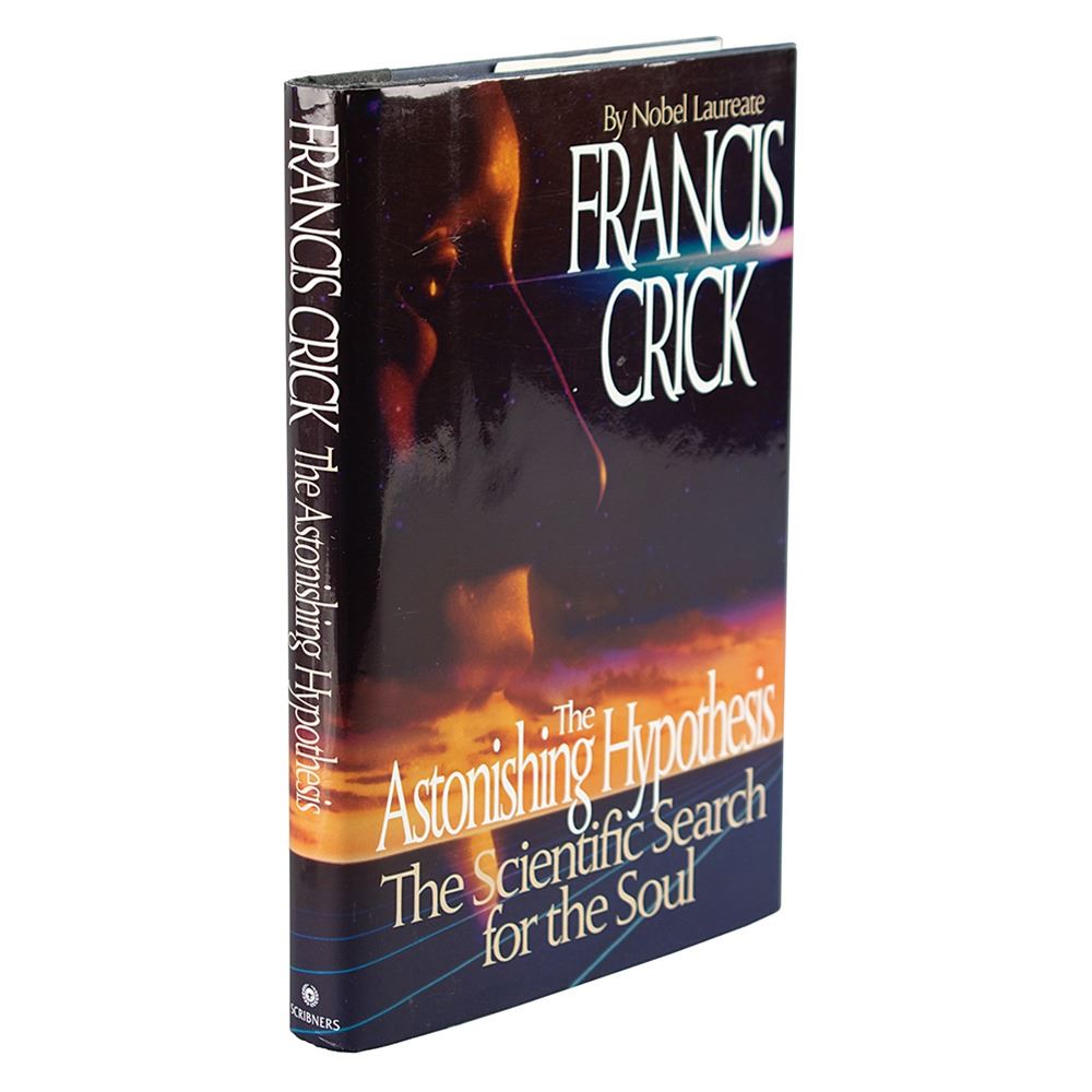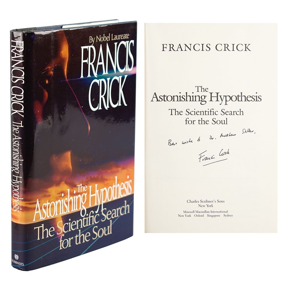 Signed book: The Astonishing Hypothesis: The Scientific Search for the Soul. First edition. NY: Charles Scribner's Sons, 1994. Hardcover with dust jacket, 6.25 x 9.5, 317 pages. Signed and inscribed on the title page in black felt tip by Francis Crick. In fine condition. Accompanied by a transmittal letter from his office, dated October 6, 1994.