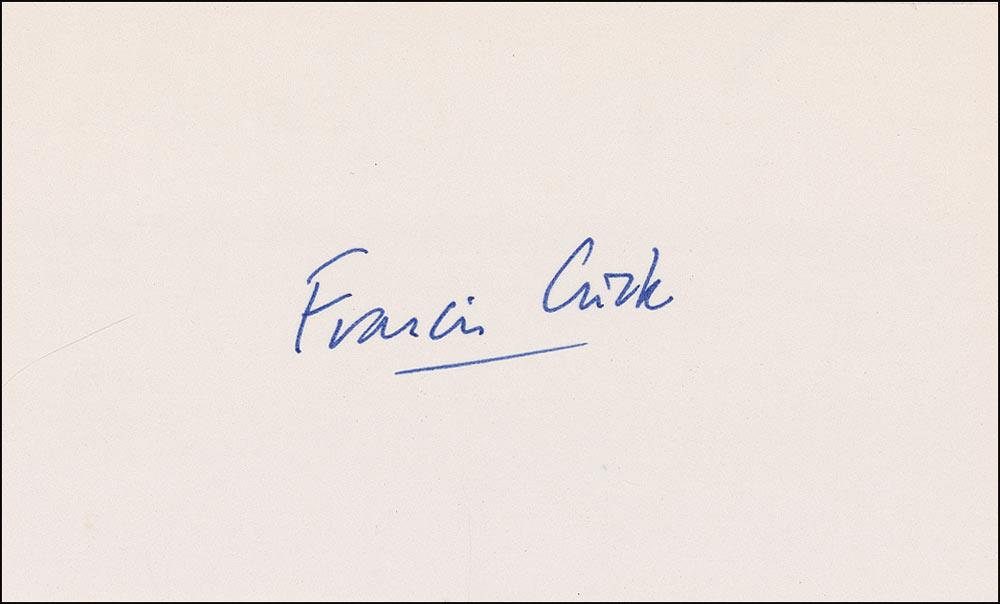 Along with Maurice Wilkins and James D. Watson, Crick shared the 1962 Nobel Prize in Medicine for discovering the function and structure of DNA, providing enormous impetus for research in the emerging fields of molecular genetics and biochemistry. Crisp ink signature, “Francis Crick,” on an off-white 5 x 3 card. In very fine condition.