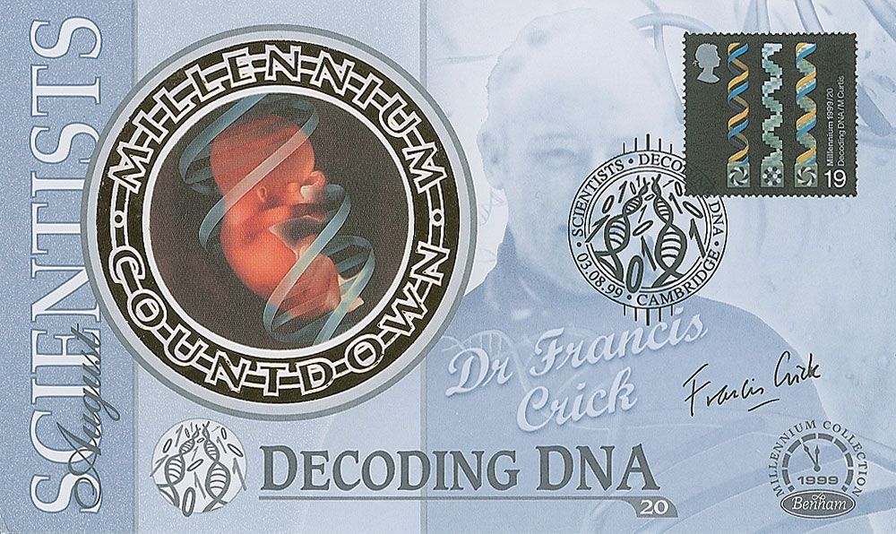 Commemorative cover, 7.5 x 4.5, with a cachet honoring the millennium countdown and the decoding of DNA, signed in black ink by Crick. In very fine condition.