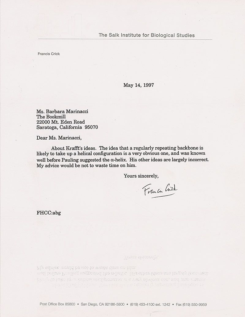 TLS, one page, 8.5 x 11, The Salk Institute letterhead, May 14, 1997. Letter to Barbara Marinacci, editor of the book entitled Linus Pauling in His Own Words. In full: “About Krafft’s ideas. The idea that a regularly repeating backbone is likely to take up a helical configuration is a very obvious one, and was known well before Pauling suggested the a-helix. His other ideas are largely incorrect. My advice would be not to waste time on him.” In fine condition.