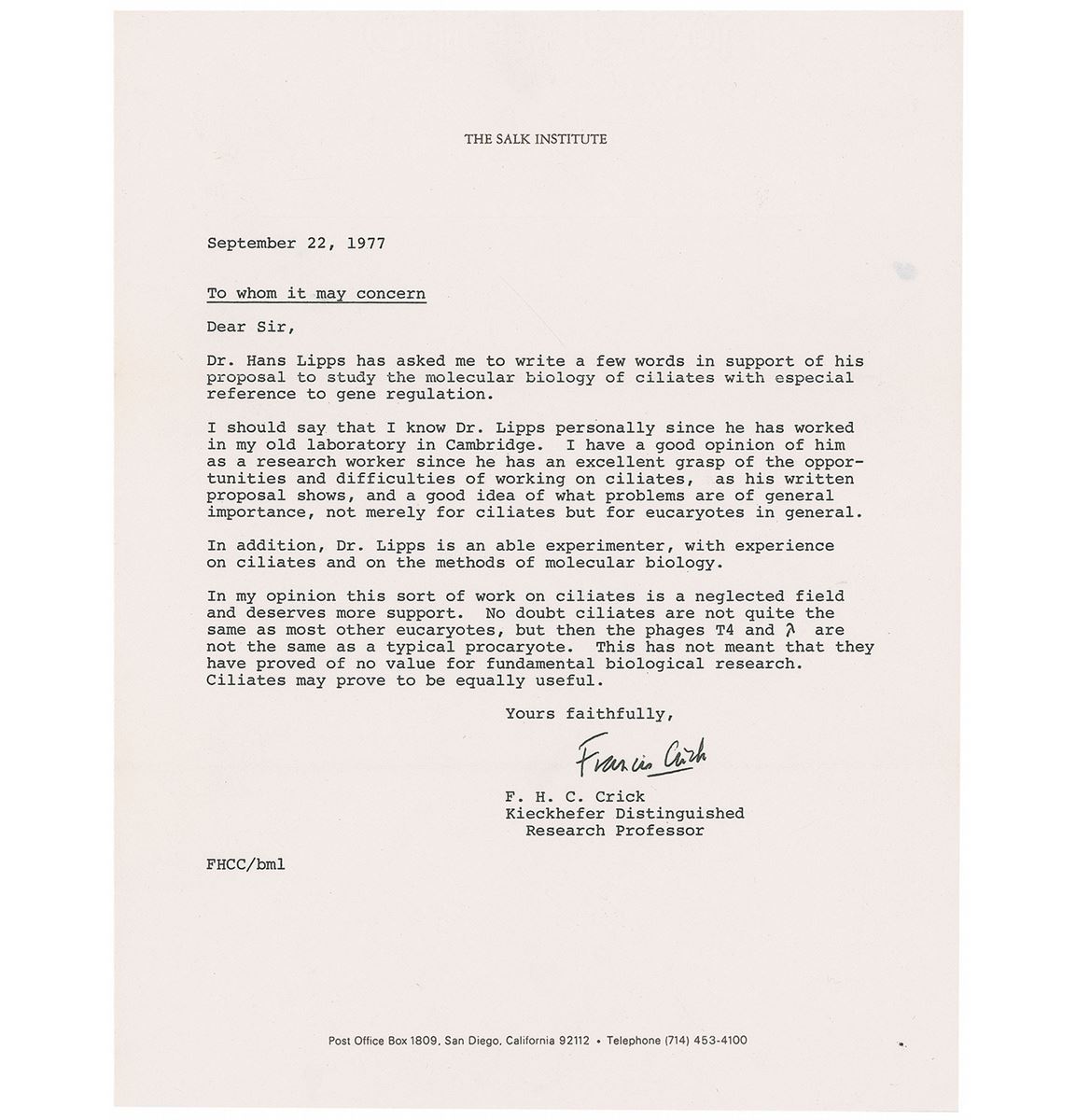 Two TLSs: a TLS signed “Francis Crick,” one page, 8.5 x 11, The Salk Institute letterhead, September 22, 1977. Letter of recommendation for Dr. Hans Joachim Lipps. In part: “Dr. Hans Lipps has asked me to write a few words in support of his proposal to study the molecular biology of ciliates with especial reference to gene regulation…I know Dr. Lipps personally since he has worked at my old laboratory…he has an excellent grasp of the opportunities and difficulties of working on ciliates…and a good idea of problems of general importance, not merely for ciliates but for eucaryotes in general…this sort of work on ciliates is a neglected field and deserves more support. No doubt ciliates are not quite the same as most other eucaryotes, but then the phages T4 and ? are not the same as a typical procaryote. This has not meant that they have proved of no value for fundamental biological research. Ciliates may prove to be equally as useful.” The second TLS of the same date, signed “Francis,” is the transmittal letter to Dr. Lipps for this recommendation. In overall fine condition, with light creases. Lipps did eventually get funding for his studies of ciliates and published a well-known paper in 1996, ‘Macronucleus structure and macronucleus development in hypotrichous ciliates,’ in which he explains how studying ciliates provides an unusual opportunity to study the ways in which DNA sequences can be manipulated in a differentiating cell. Crick’s understated closing remark on the importance of “phages T4 and ?” should not go unnoticed—it was in observing mutations of the T4 phage that Crick demonstrated the triplet nature of the genetic code, one of the steps along the way to understanding DNA structure.
