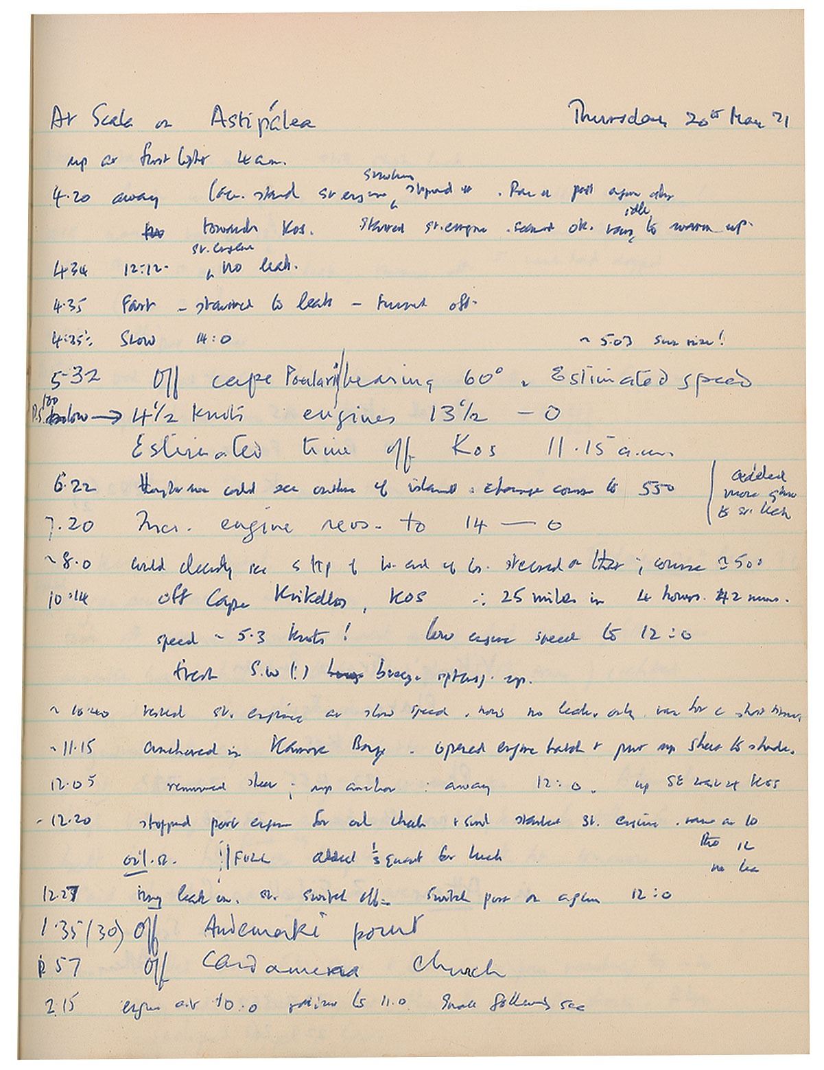 A formidable offering given the dearth of Crick personal effects that appear on the auction market—having first opened this logbook some six years after receiving the 1962 Nobel Prize in Physiology or Medicine, Crick chronicles his days and nights touring the Greek coastlines with expected fastidious attention to detail, his impressively ordered notes and vessel-monitoring offering an unparalleled glimpse into the inner workings of Crick’s mind.