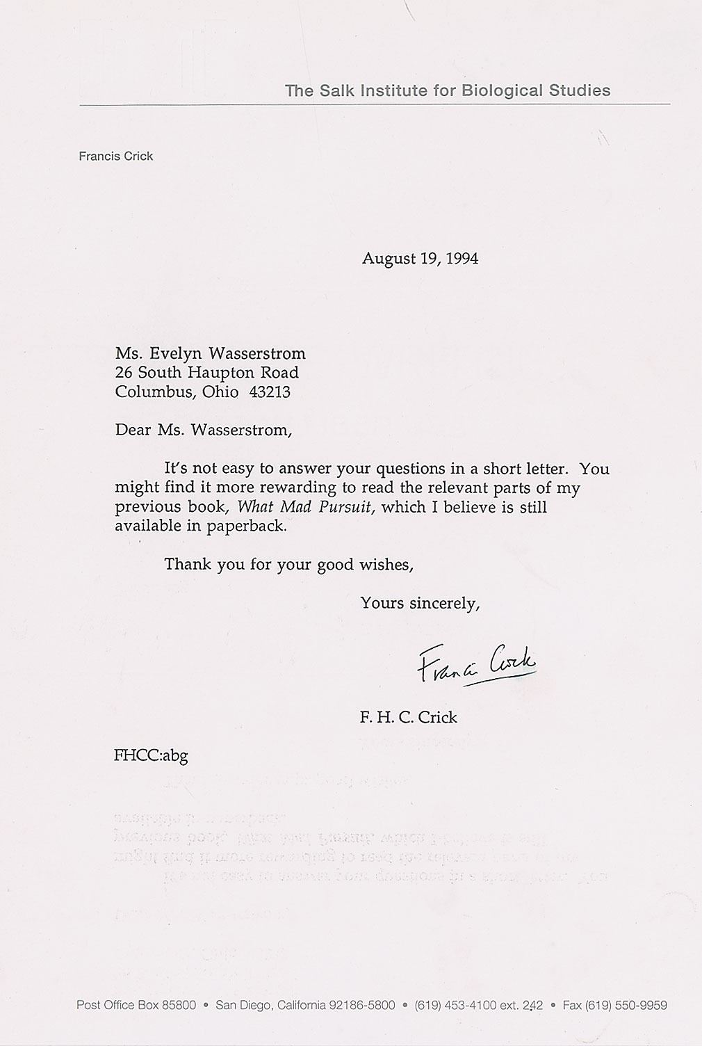 TLS, one page, 7 x 10.75, The Salk Institute for Biological Studies letterhead, August 14, 1994. Letter to Evelyn Wasserman, in part: "It's not easy to answer your questions in a short letter. You might find it more rewarding to read the relevant parts of my previous book, What Mad Pursuit, which I believe is still available in paperback." In fine condition. Accompanied by the original mailing envelope. First published in 1988, What Mad Pursuit: A Personal View of Scientific Discovery lent important insight into Crick's work on DNA structure, the genetic code, and his later work in neuroscience and theoretical biology.