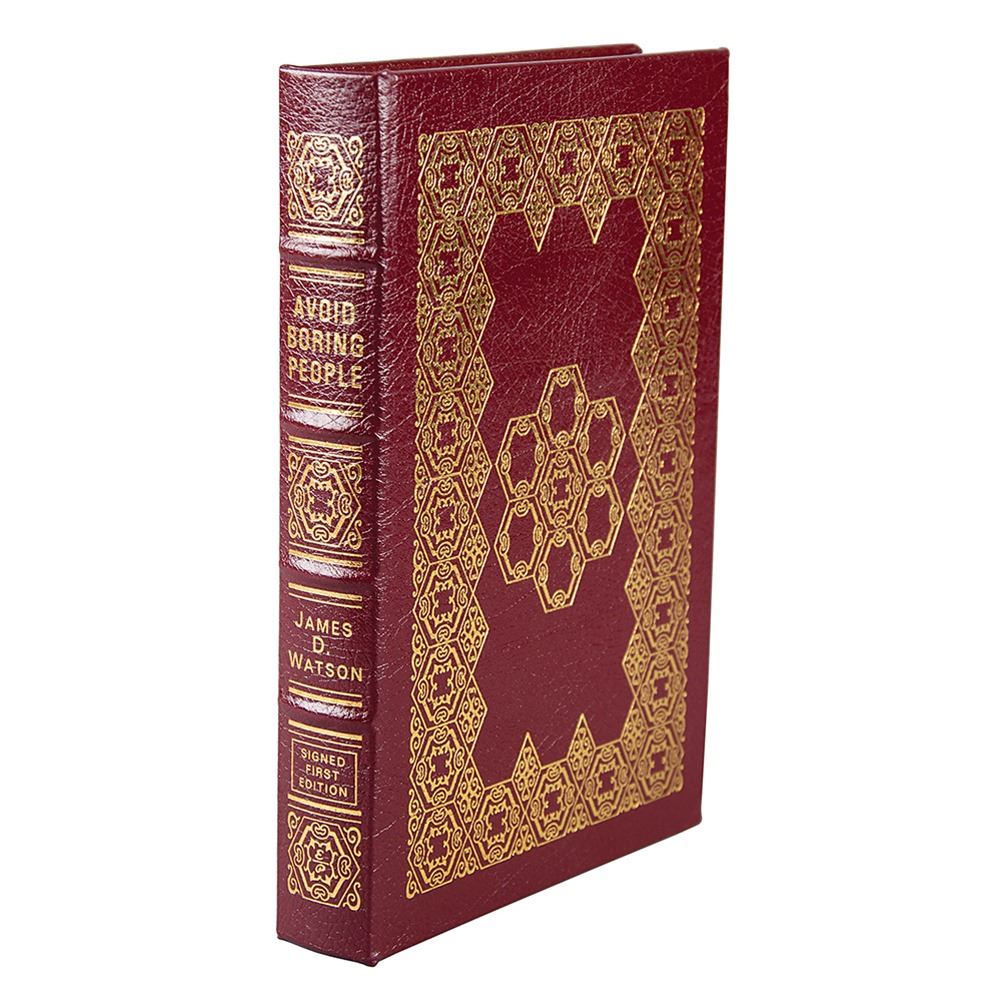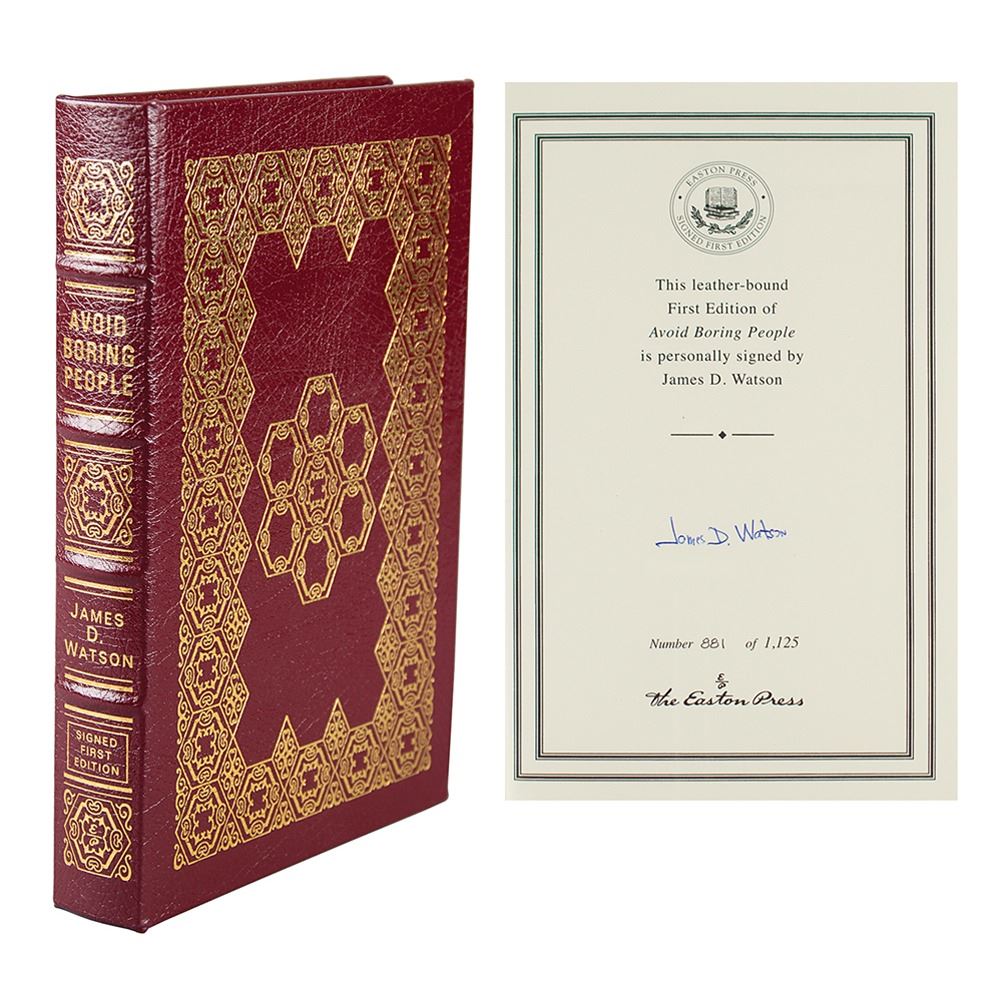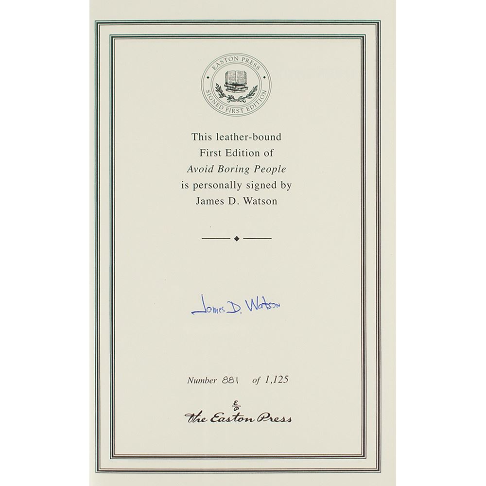 Signed book: Avoid Boring People. Limited first edition, numbered 881/1125. Norwalk, CT: Easton Press, 2007. Leather-bound hardcover, 6.5 x 9.5, 347 pages. Signed on the colophon in blue ballpoint by James D. Watson. In very fine condition. Accompanied by a certificate of authenticity from the publisher.