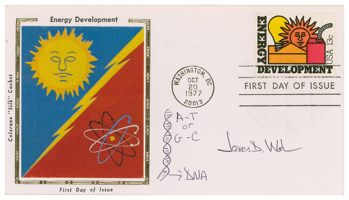 Co-winner of the 1962 Nobel Prize for Physiology or Medicine for the discovery of DNA. Original signed ballpoint sketch of a double helix DNA strand, with a notation of “A-T, G-C,” next to the strand on a 6.5 x 3.75 First Day Cover, which bears a color silk cachet honoring energy development, and signed “James D. Watson.” In fine condition. Particularly elusive in uninscribed examples.