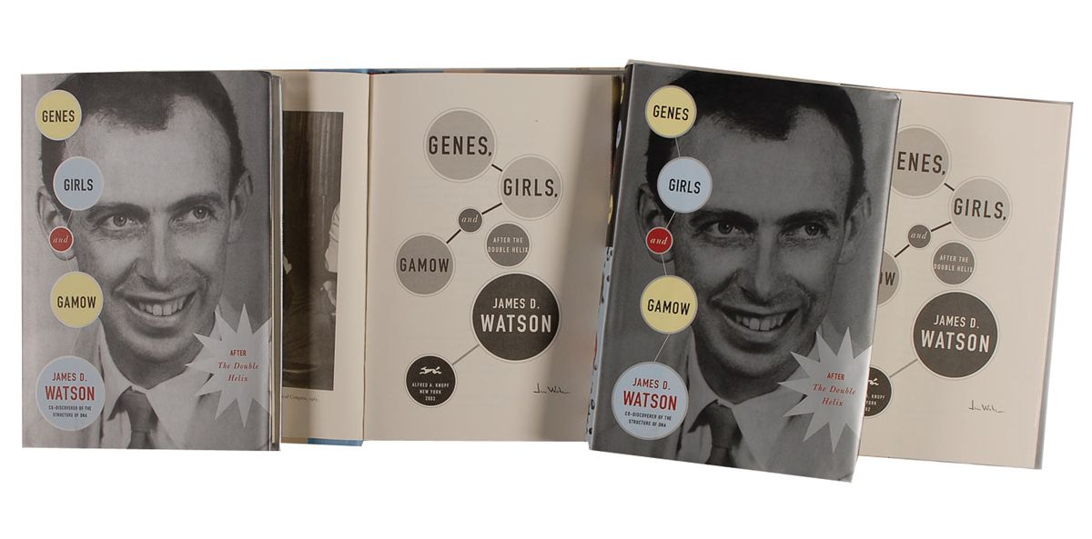 Four hardcover copies of Genes, Girls, and Gamow, each First American Editions and signed on the title page in black ballpoint by Watson. In fine condition.