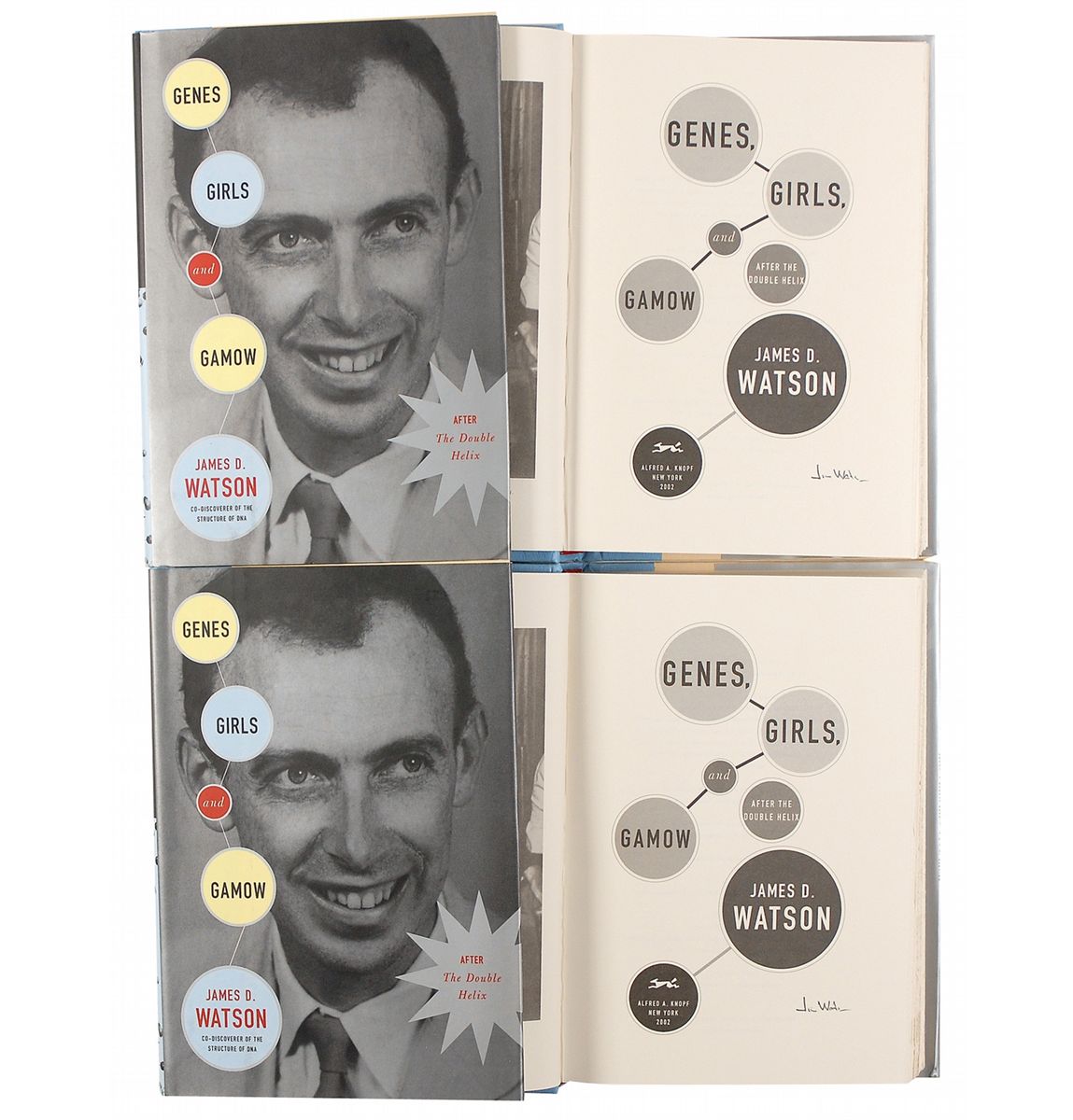 Four hardcover copies of Genes, Girls, and Gamow, each First American Editions and signed on the title page in black ballpoint, “Jim Watson.” In fine condition, with price labels affixed to back of dustjackets.