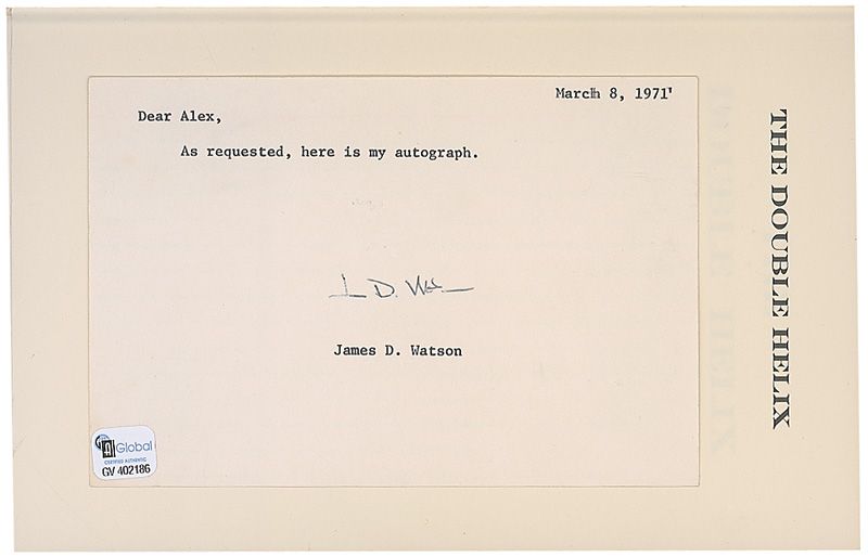 TNS signed “James D. Watson,” one page, 6 x 4, March 8, 1971. Brief note to a collector. In full: “As requested, here is my autograph.” Letter is affixed to the half-title page of a first edition of The Double Helix. In fine condition, with an authentication label affixed to lower corner of note.