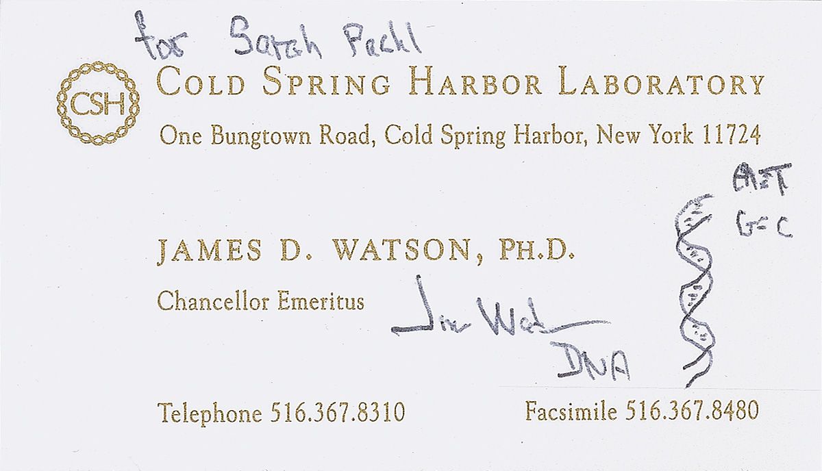 Original ballpoint sketch of a double helix DNA strand on a 3.5 x 2 business card, signed and inscribed “For Sarah Pachl, James D. Watson, DNA.” In fine condition.