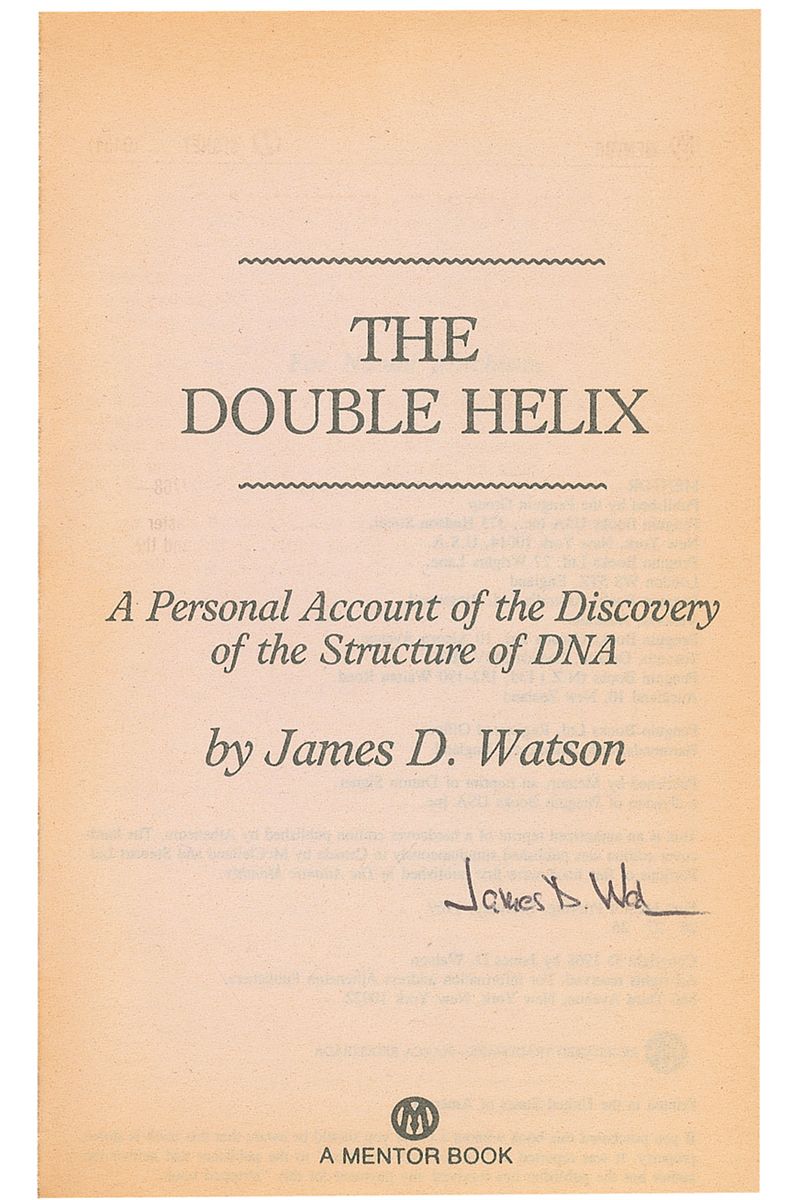 Signed book: The Double Helix. Later printing. NY: Mentor, 1969. Paperback, 4.25 x 7, 143 pages. Signed on the title page in black ballpoint. Mild toning to signed page and remaining inside pages, and scattered wear and creasing to covers and spine, otherwise fine condition.