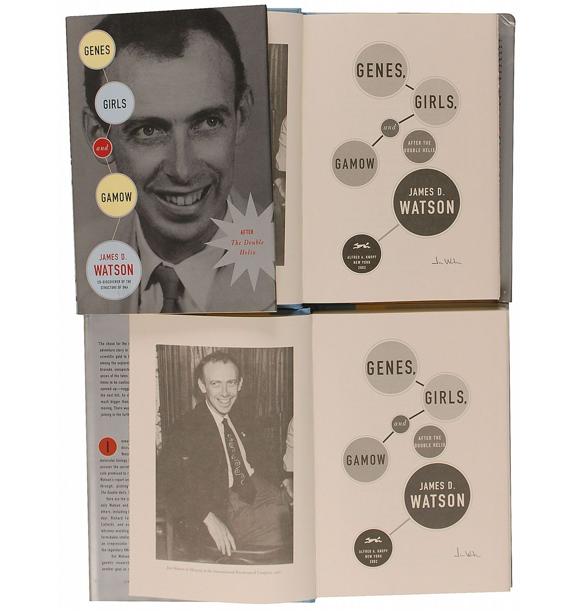 Three hardcover copies of Genes, Girls, and Gamow, each First American Editions and each signed on the title page in black ballpoint, “Jim Watson.” In fine condition, with price labels affixed to back of dust jackets.