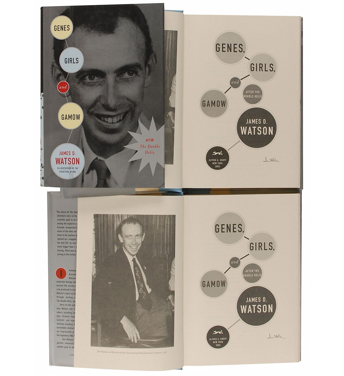 Three hardcover copies of Genes, Girls, and Gamow, each First American Editions and each signed on the title page in black ballpoint, “Jim Watson.” In fine condition, with price labels affixed to back of dust jackets.