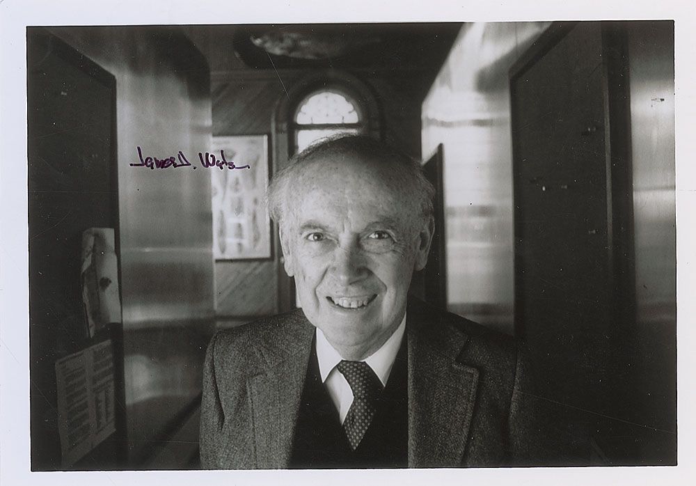 Glossy 7 x 5 photo of Watson in a suit and tie, signed in black felt tip, “James D. Watson.” In very fine condition.