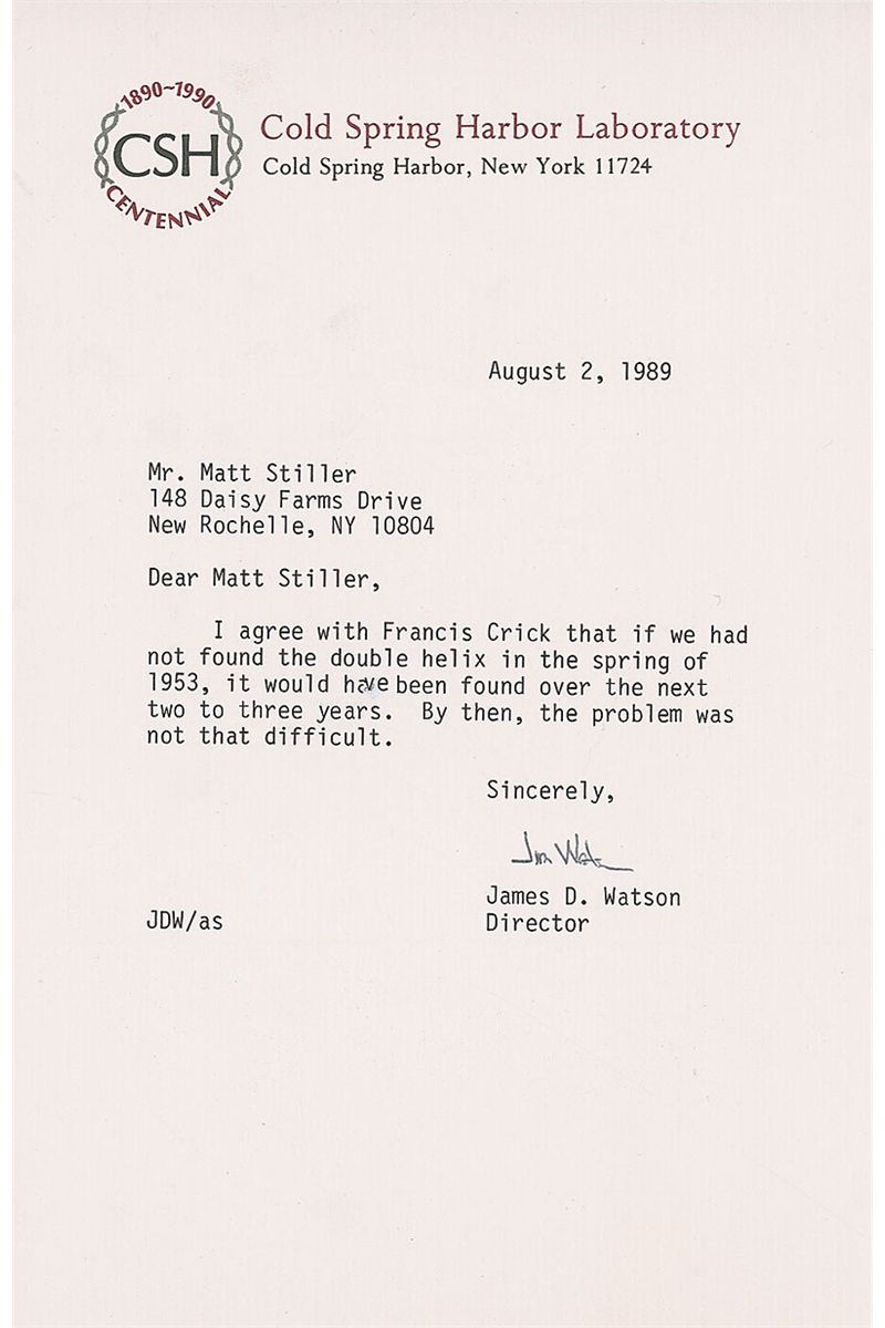 TLS signed “Jim Watson,” one page, 5.5 x 8.5, Cold Spring Harbor Laboratory letterhead, August 2, 1989. Letter to an admirer. In full: “I agree with Francis Crick that if we had not found the double helix in the spring of 1953, it would have been found over the next two to three years. By then, the problem was not that difficult.” In fine condition. Accompanied by the original mailing envelope.