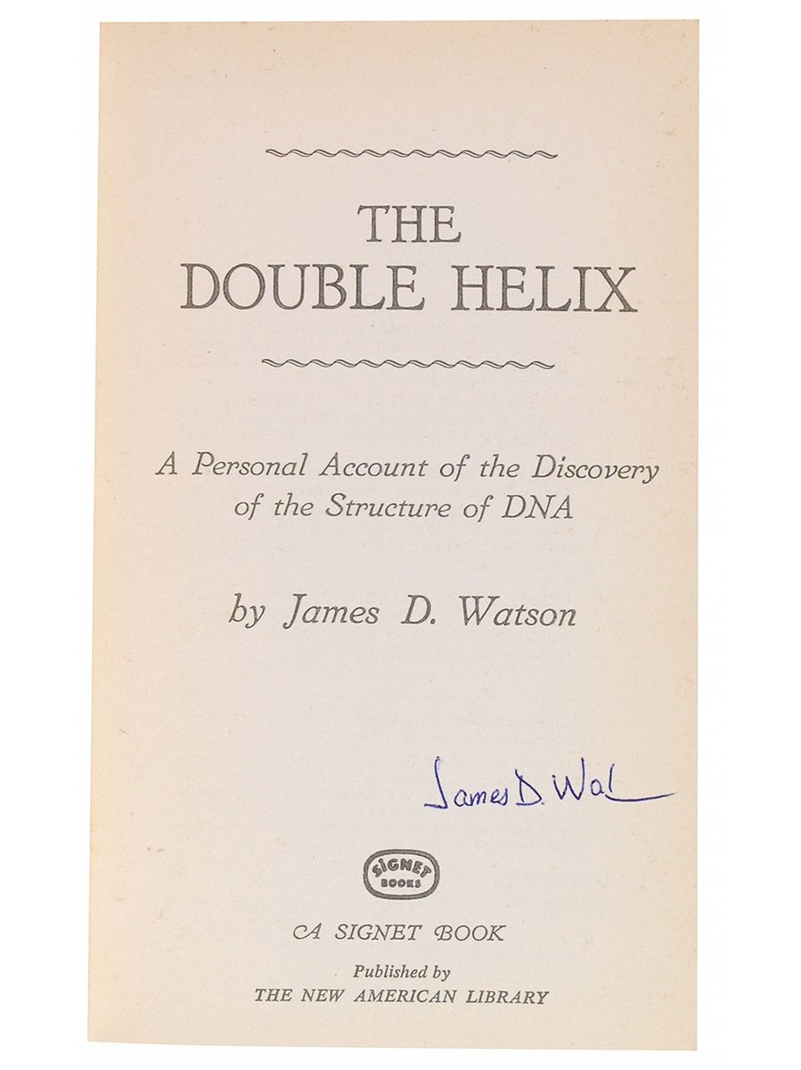 Signed book: The Double Helix. NY: Signet, 1968. Paperback, 4.25 x 7, 141 pages. Signed on the title page in blue ballpoint, “James D. Watson.” In fine condition, with a mild shade of toning to inside pages.