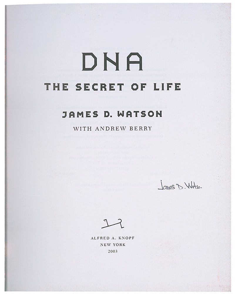 Signed book: DNA: The Secret of Life. First edition. NY: Alfred A. Knopf, 2003. Hardcover with dust jacket, 7.75 x 9.5, 446 pages. Signed on the title page in black ballpoint. In fine condition.