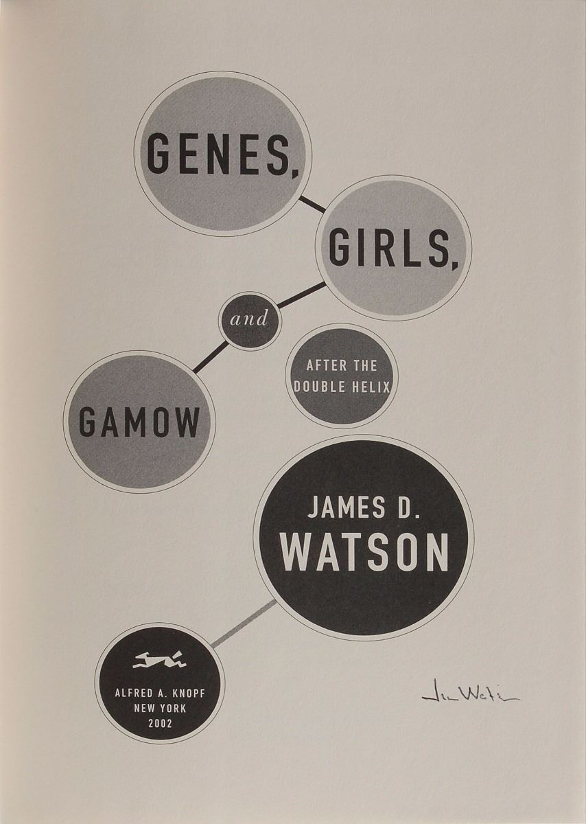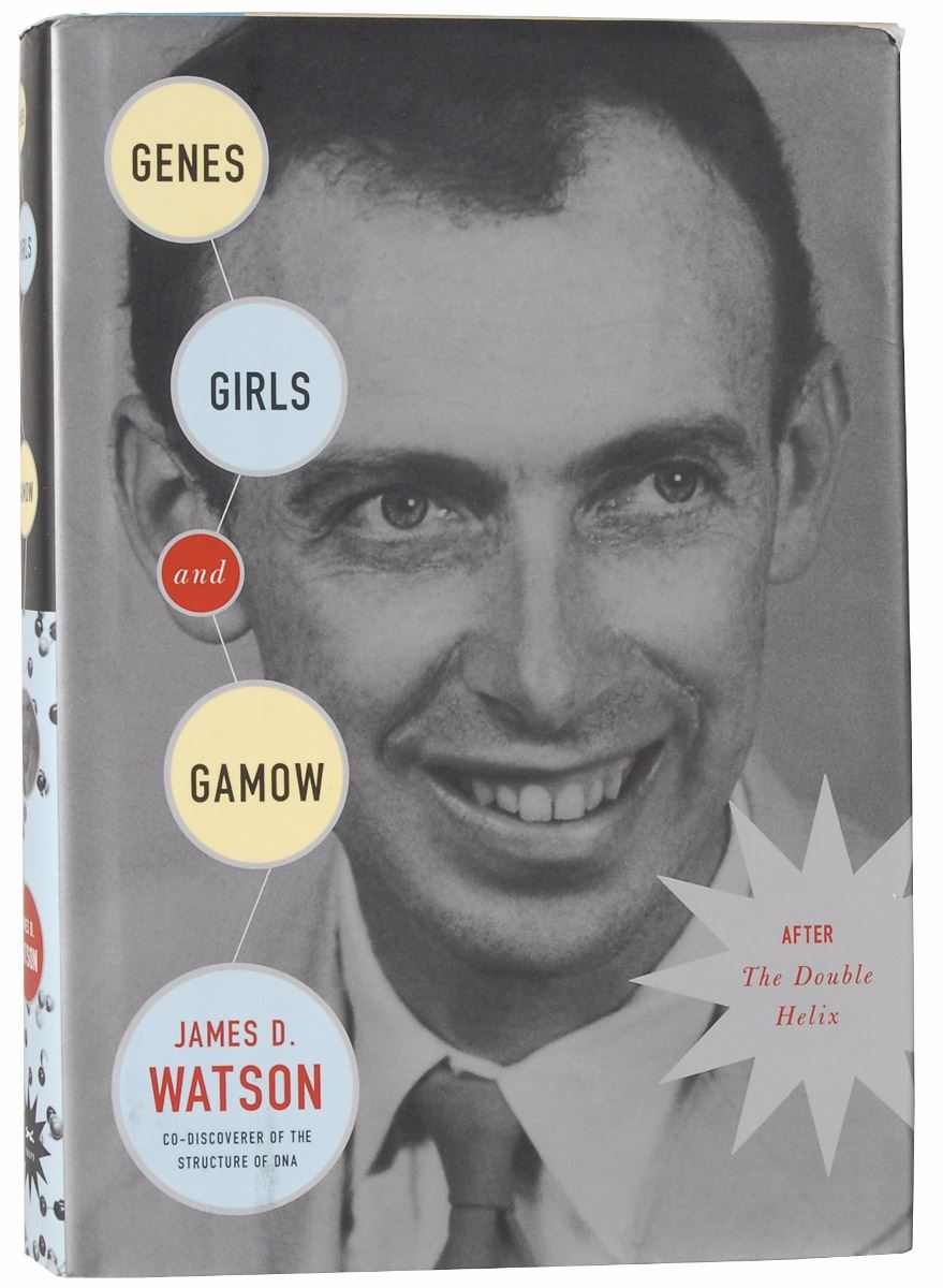 Signed book: Genes, Girls, and Gamow. First American edition. NY: Alfred A. Knopf, 2002. Hardcover with dust jacket, 6.5 x 9.5, 259 pages. Signed on the title page in black ballpoint, “Jim Watson.” In very fine condition.