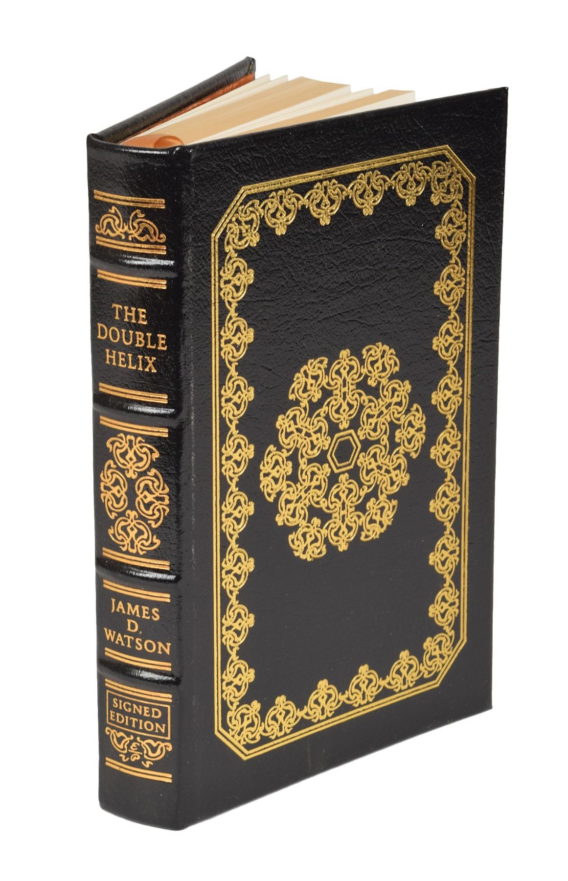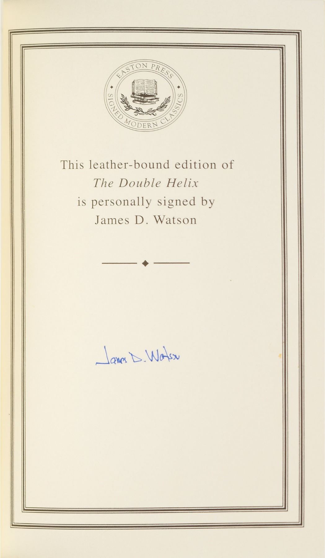 Signed book: The Double Helix. Collector's edition. Norwalk, CT: Easton Press, 2009. Leather-bound hardcover, 5.75 x 8.75, 226 pages. Signed on the colophon in blue ink by Watson. In very fine condition.