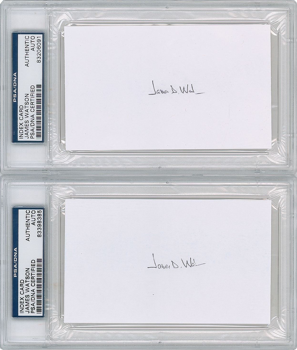Two ballpoint signatures, "James D. Watson," on individual white 5 x 3 cards. In very fine condition. Both encapsulated in PSA/DNA authentication holders.