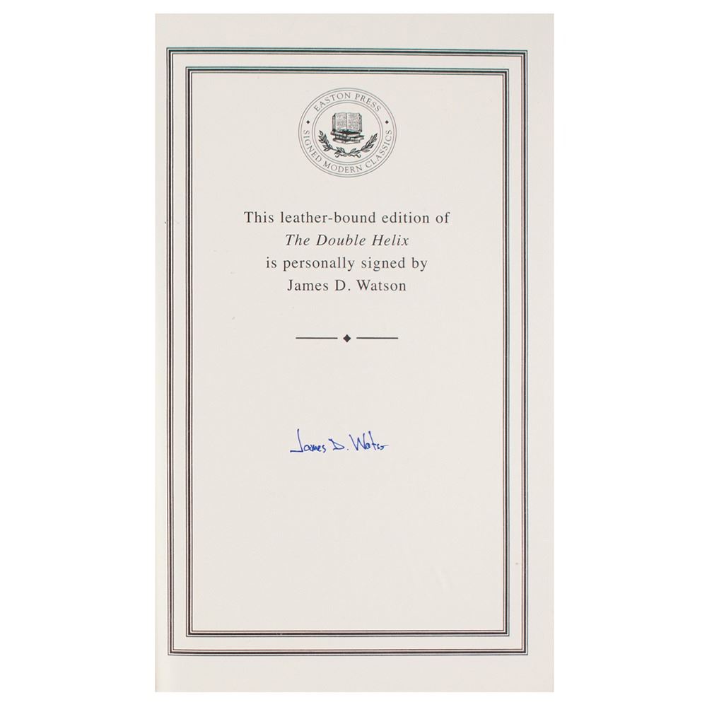 Signed book: The Double Helix. Collector's edition. Norwalk, CT: Easton Press, 2009. Leather-bound hardcover, 5.75 x 8.75, 226 pages. Signed on the colophon in blue ink by James D. Watson. In very fine condition.