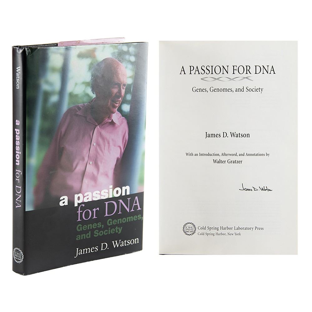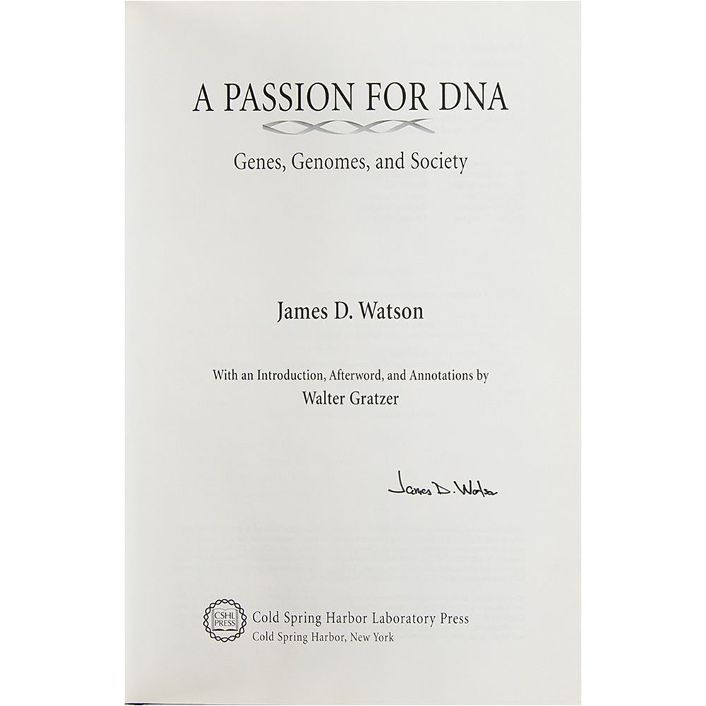 Signed book: A Passion for DNA: Genes, Genomes and Society. First edition. Cold Spring Harbor, NY: Cold Spring Harbor Laboratory Press, 2000. Hardcover with dust jacket, 6.25 x 9.5, 250 pages. Signed on the title page in black felt tip, "James D. Watson." In very fine condition.