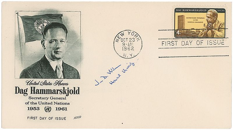 FDC with a cachet honoring Dag Hammarskjold, UN Secretary General, signed in blue ballpoint, “James D. Watson, Harvard University.” In fine condition.