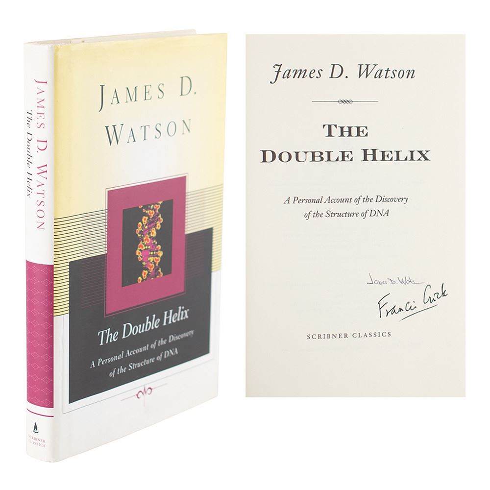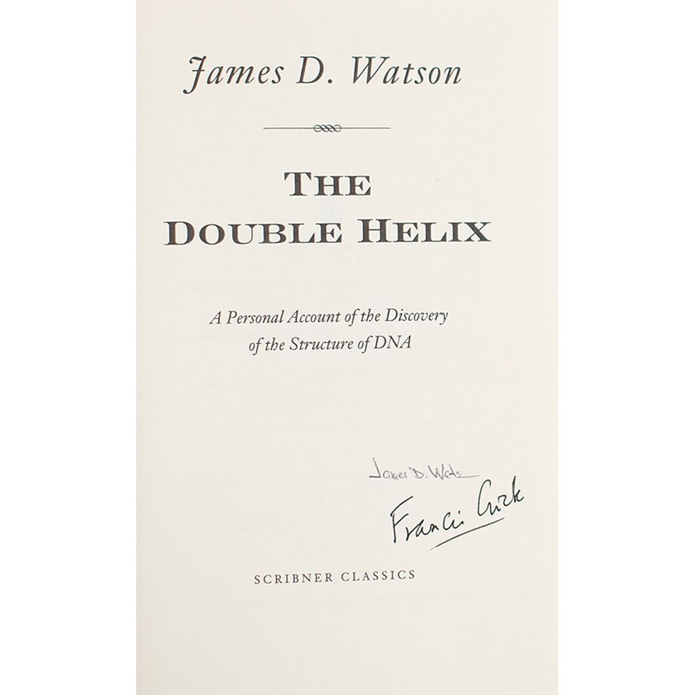 Signed book: The Double Helix: A Personal Account of the Discovery of the Structure of DNA. Later printing. NY: Scribner Classics, 1998. Hardcover with dust jacket, 5.75 x 8.75, 226 pages. Signed on the title page in black ballpoint, "James D. Watson," and in black felt tip, "Francis Crick." In fine condition.