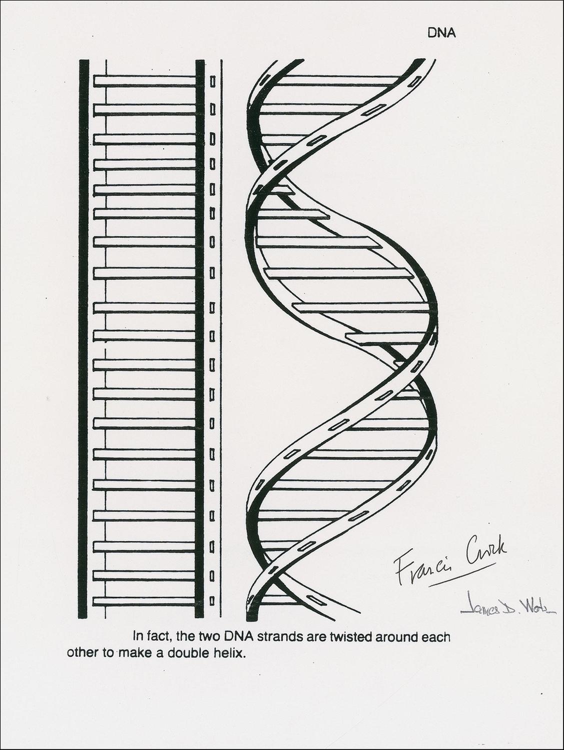 Along with Maurice Wilkins, James D. Watson (born 1928) and Francis Crick (1916–2004) shared the 1962 Nobel Prize in Medicine for discovering the function and structure of DNA, providing the prime impetus for further research in the emerging fields of molecular genetics and biochemistry. Photocopy on off-white cardstock of a DNA double helix, 8.5 x 11, signed in black ink “Francis Crick” and “James D. Watson.” Faint bend to one corner, otherwise fine condition.