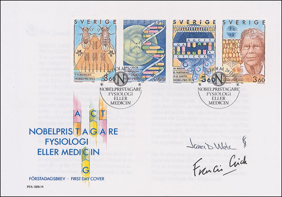 Commemorative honoring the Nobel Prize for “Fysiologi Eller Medicin,” signed in black ballpoint by Watson, adding a small sketch of a double helix, and in black felt tip by Crick. In fine condition. The commemorative cover also features four Swedish stamps, all featuring Nobel Prize winners in physiology and medicine, including Watson and Crick.