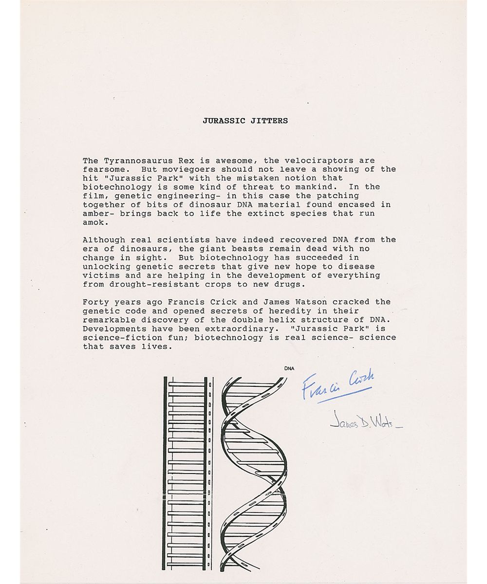Souvenir typescript, one page, 8.5 x 11, entitled ‘Jurassic Jitters,’ featuring two printed sketches of DNA strands at the bottom. In part: “The Tyrannosaurus Rex is awesome, the velociraptors fearsome. But moviegoers should not leave a showing of the hit Jurassic Park with the mistaken notion that biotechnology is some kind of threat to mankind…Although real scientists have indeed recovered DNA from the era of dinosaurs, the giant beasts remain dead, with no change in sight.” Signed at the conclusion in blue ink by Francis Crick and in black ink by James D. Watson. In fine condition.