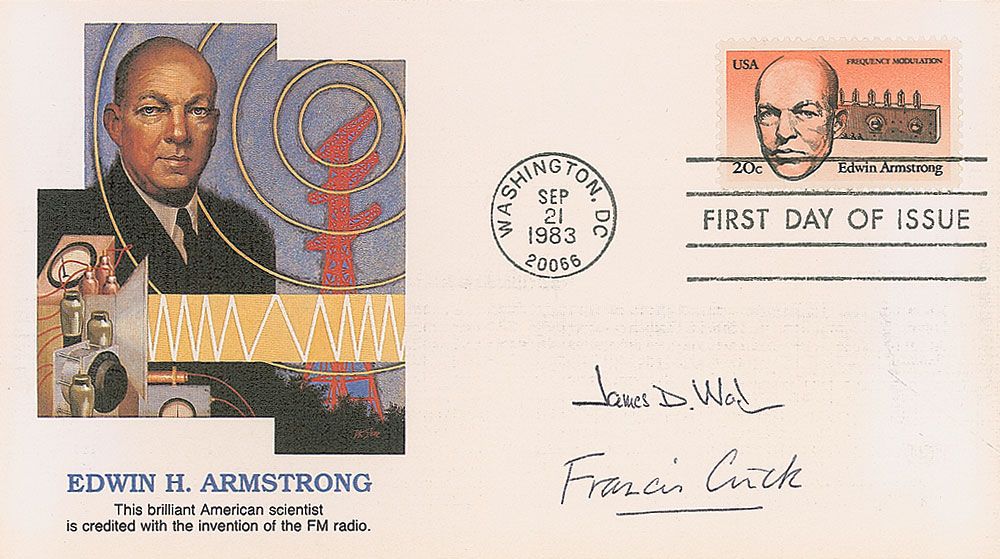 FDC with a cachet honoring Edwin H. Armstrong, signed in black ballpoint, “James D. Watson,” and “Francis Crick.” In fine condition.