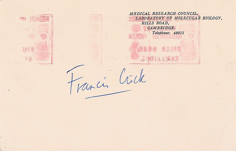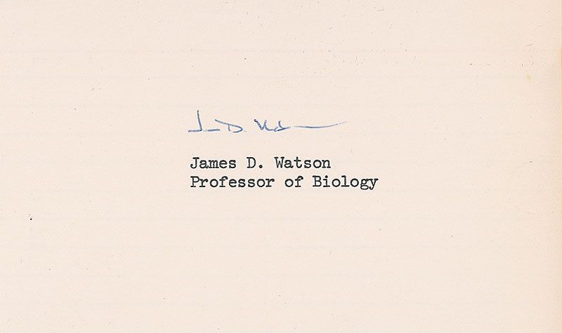 Ballpoint signature, “James D. Watson,” on an off-white 5 x 3 card; and a ballpoint signature, “Francis Crick,” on an off-white 5.5 x 3.5 postcard. In fine condition, with a couple creases to postcard.