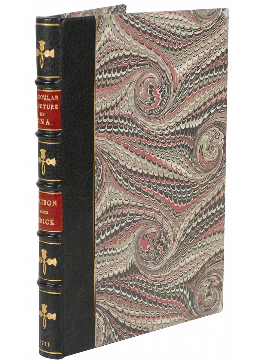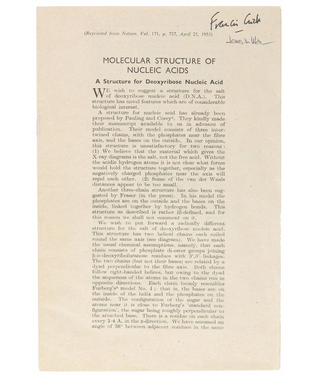 Signed offprint article: ‘Molecular Structure of Nucleic Acids: A Structure for Deoxyribose Nucleic Acid.’ Off-print from: Nature Vol. 171 (April 25, 1953), 14 pages. Original self-wrappers. Signed on the first page in black ballpoint, “James D. Watson” and black felt tip “Francis Crick.” Includes an attractive custom-made leatherbound clamshell case. In very fine condition. This is the enormously desirable rare first edition off-print of the article announcing the discovery of the double-helix structure of DNA, the single most important breakthrough in the history of the life sciences. An exceedingly scarce example, signed by Watson and Crick on the first page and thus eminently suited for exhibition.