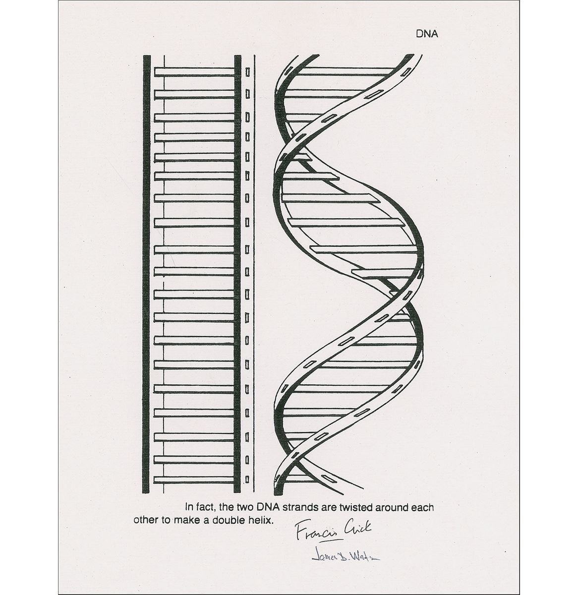 Printed signed sketch of a double helix on an off-white 8.5 x 11 sheet, signed at the bottom in black ink, “Francis Crick,” and “James D. Watson.” In fine condition. A quintessential DNA-related item—this scarce signed image symbolizes one of the greatest discoveries in biology.